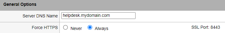 Update the Server DNS name field with your server DNS name. Do not enterlocalhost, as this server DNS name does not resolve outside of the WHD server.