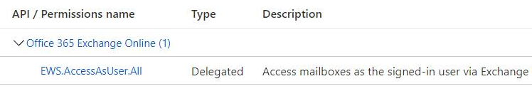 Search for and select the following permission: Office 365 Exchange OnlineWhen you are finished, EWS.AccessAsUser.Allshould be your only permission, as shown below.