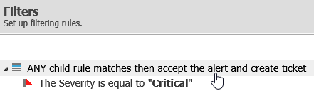 You can add an And/Or block to a create a filter rule based on more than one condition. The Any rule creates a ticket when any child condition is true. The All rule creates a ticket only when all child conditions are true.