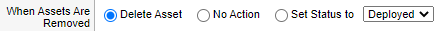 Select Delete Asset to delete the asset from the database. Select No Action to leave the asset in the database. Select Set Status To if you want to leave the asset in the database but set its status to another value.