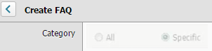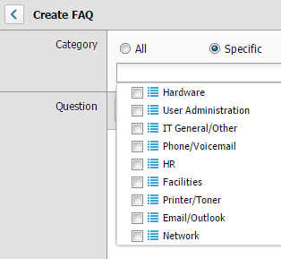 In the Create FAQ screen, select a category for this FAQ. Select All for all categories.   Select Specific and click the drop-down arrow to select two or more categories. This menu is populated from the ticket request types. You can add additional request types. See Define request types for more information.   If a parent or child category is disabled, you do not have the appropriate permissions to access the category level.