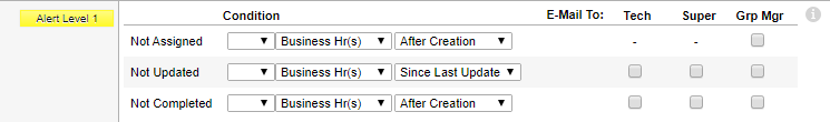 In the Alert Level rows, set the conditions for each Alert Level, beginning with Alert Level 1 and ending with Alert Level 3. A ticket meets a given alert level when any of the alert conditions are met. In this example, accept the default selections in alert levels 1 through 3 to indicate no alert levels because no alert conditions (Due Time and Client Reminder Interval) were selected.