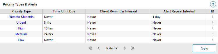 Click Save. The Remote Students priority type displays in the Priority Types and Alerts window with the default priority types.   Notice that the Time Until Due and Client Reminder Interval setting are set to Never. This occurs when you accept the default selections for these settings.