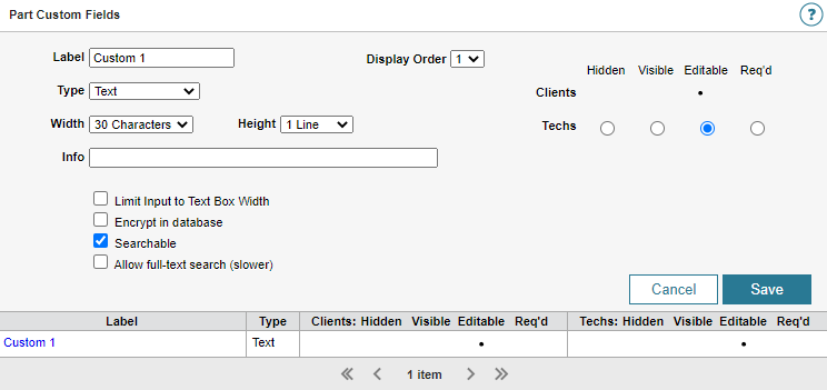 In the Techs section, select the appropriate tech permissions, defining whether the custom field is hidden, visible, or required.  Administrators have at least Editable access to all custom fields. Required fields are required for all administrators. Administrators have at least Editable access to all custom fields. Required fields are required for all administrators.