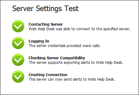 When Web Help Desk creates a connection with a SolarWinds Orion alert source, the checked areas in the window contain green check marks.