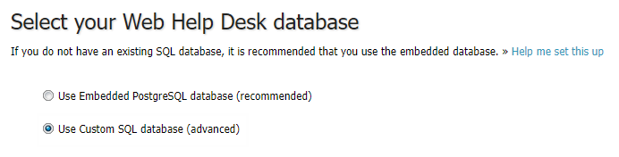 Return to the Select your Web Help Desk database window in the installation procedure.