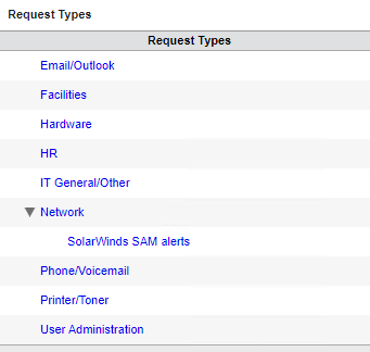 To create a nested request type, select the parent type (for example, Network). Optionally, click