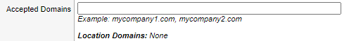 In the Accepted Domains field, enter the email domain of the CC or BCC recipient's email address. For example, mycompany.com.   This field specifies which domains are accepted when Web Help Desk does not recognize a sender's email address. If the email address domain is not in the Accepted Domains list, Web Help Desk will notify the sender by email that the address contains an unauthorized domain. If the email address domain is included in the Accepted Domains list, a new account will be created for the unauthorized user. If the address matches an Accepted Domain that was defined for a location, the new account is assigned to that location.