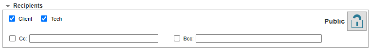 Under Recipients, select the client or tech checkbox to indicate who receive details about this ticket. If the recipient is not a client or tech, enter their email address in the Cc or Bcc fields and then select the corresponding checkbox. See Enable ticket updates from unauthorized users for guidance.
