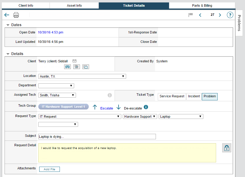 Web Help Desk uses three types of tickets to facilitate this type of ticket resolution: Service, Problem, and Incident.