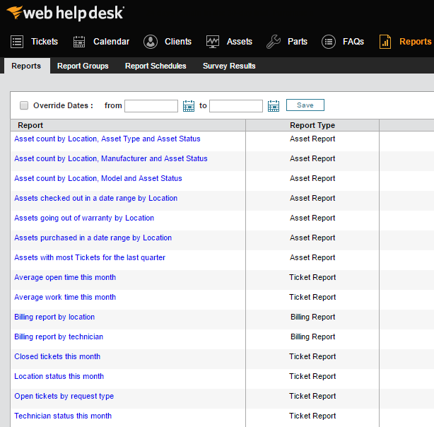 Using sample reports included with Web Help Desk, you can create asset and ticket reports to help you monitor technician performance, customer support needs by location, and incidence frequency. Using additional features incorporated into reports, you can categorize reports into report groups, generate survey results, and schedule automated reports for distribution.