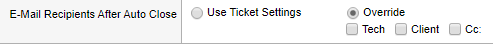 You can configure Web Help Desk to respond differently when a ticket auto-closes. For this situation, you can enable the application to send email to the recipients set in the ticket or reset the ticket recipients to Tech, Client, or Cc.