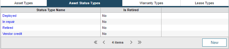 In the following example, four asset statuses are created. Asset status is optional when you create a new asset.