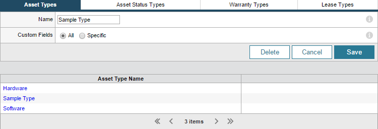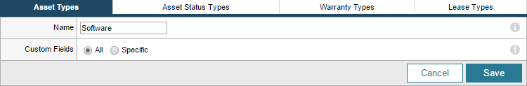 Assets are grouped into asset types—for example, hardware and software. Asset types help you manage a large number of assets, and can be used when searching for assets and filtering asset report data.