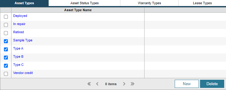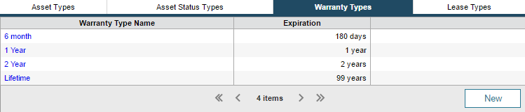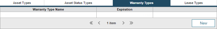 An asset warranty type helps you manage assets with an expiring warranty. When you track warranty information, you can generate reports that include the warranty expiration date, and use that information to purchase an extended warranty, if required.