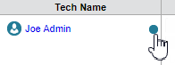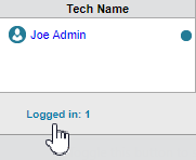In the Tech Name column, locate the icon next to a tech name. Techs who are logged in display a dark blue icon  next to their name. next to their name.  In this example, the  icon indicates that this tech has an Admin account. The gray box surrounding the user name is a background color you can apply to a user name. icon indicates that this tech has an Admin account. The gray box surrounding the user name is a background color you can apply to a user name.Techs who are not logged in display a gray icon  next to their name. next to their name.  In this example, the  icon indicates that this user has a Tech account. icon indicates that this user has a Tech account.