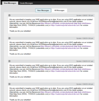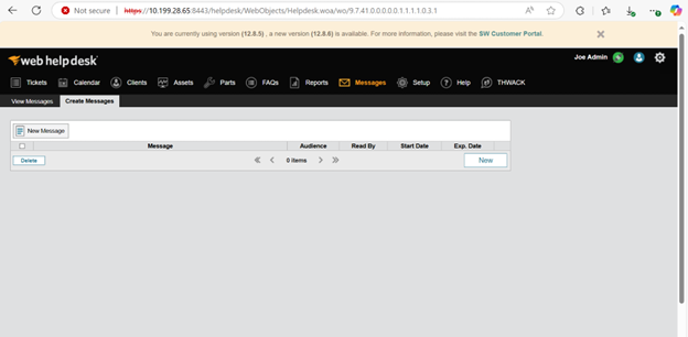 Isolated Environment: An API call is scheduled for the 1st of every month to generate a message, which will be displayed in the message box on both the TECH and Admin sides. Admin are advised to regularly check the Customer Portal Link https://customerportal.solarwinds.com - Newsroom - Web Help Desk (WHD) - THWACK.