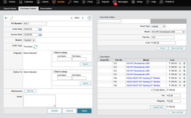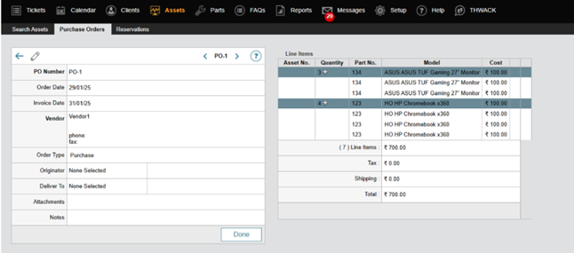 SolarWinds introduced a Line Item Header with an expansion feature, which consolidates similar assets under a single header in the Purchase Order. For example, if there are 200 units of a similar model of an asset (say, 200 MAC PRO Book), they can be grouped under a single colored header. When this header is toggled on, it expands to show all the individual asset lines underneath. When toggled off, it collapses the assets back into the single header, streamlining the management of bulk assets and reducing the need for repeatedly clicking + to duplicate entries.