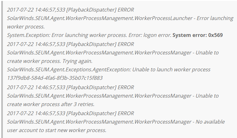 - On the SolarWinds Platform server, check the latest the log file at: C:\ProgramData\SolarWinds\Logs\SEUM\AgentWorker_v3_0_agent_workier_guid_[pid_number].log
