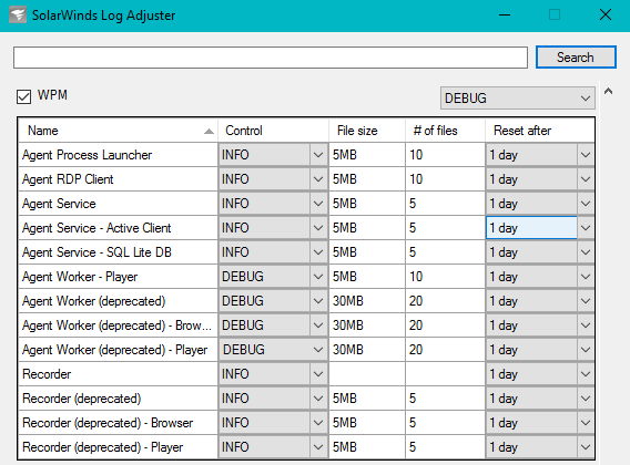 - To avoid disk space issues, return to the SolarWinds Log Adjuster to turn off DEBUG. Click Reset to default > Apply.