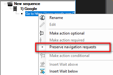 - For the step that redirects to another web page, right-click and select Preserve navigation request from the shortcut menu.