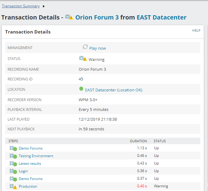 - If you cannot play the recording in the Web Transaction Recorder, run it in SolarWinds Platform Web Console instead.