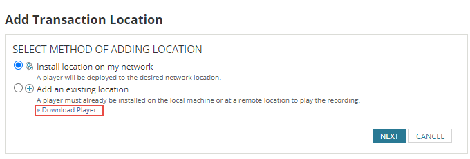 - Add an existing location. Select this option if a remote system already hosts the WPM Player service (for example, if it already hosts a WPM transaction location).