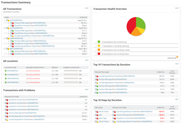 You can display different views of WPM information in the SolarWinds Platform Web Console to access a variety of information about WPM transactions as they are played back within your environment. Each view includes graph, chart, or table widgets pertaining to that view.