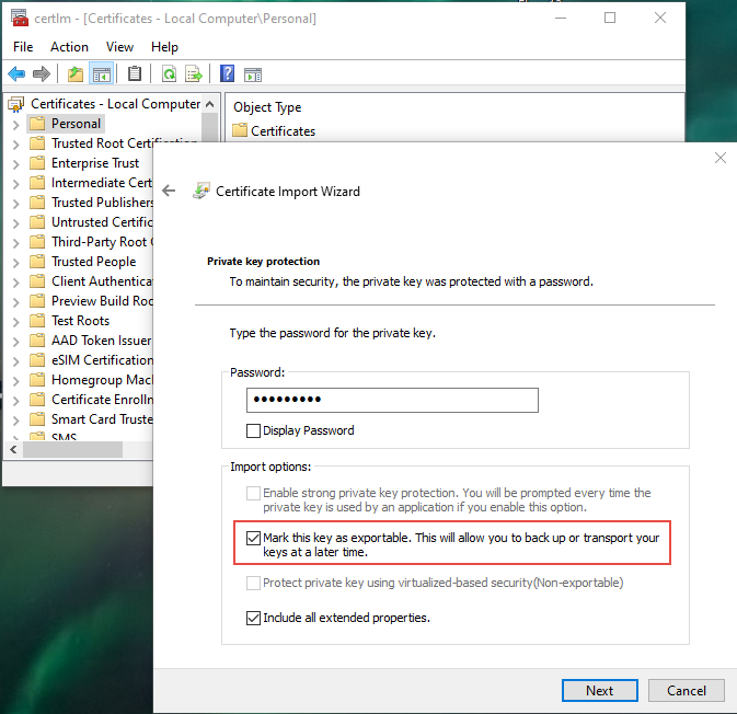 - Use the Certificate Import Wizard to add the certificate to the Personal store.