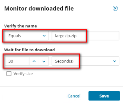 - Another step indicates if the file was downloaded successfully and matched any parameters configured for filename, download time, or file size.