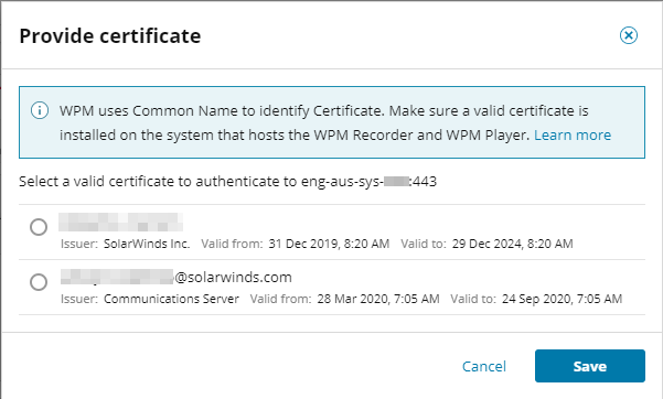 - If playback fails on a remote system that has no certificates installed, WPM will not prompt you to select a required certificate. Install at least one certificate, even if it's not the certificate the recording requires.