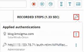 After you link a certificate to a recording, a Key icon appears at the top of the Recorded Steps pane. Click the Key icon to display certificates related to the recording and any other type of authentication that was applied. Click the Options (