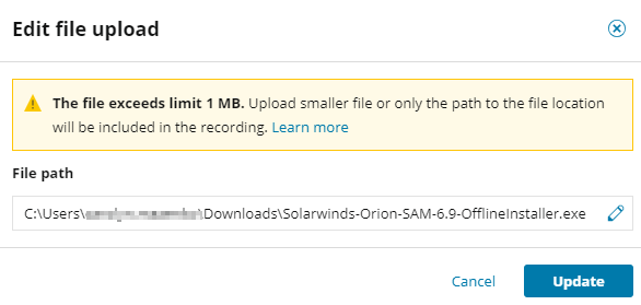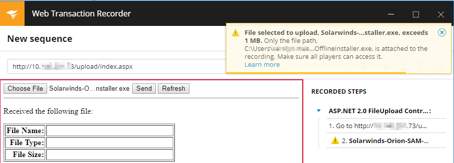 If you select a file over 1 MB, only the file path is tracked by WPM to prevent performance issues. To ensure that transactions based on a recording can upload the file, you'll need to either: