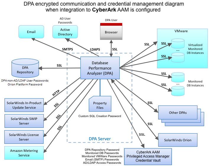 The following diagram provides information about DPA communication protocols and password storage when DPA is configured to use credentials stored in CyberArk. The arrow direction represents connection establishment.