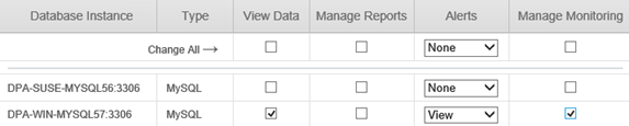 In the example below, the user can access data from only one database instance. This user can make changes to monitoring options, run reports, and view existing alerts for the selected instance.