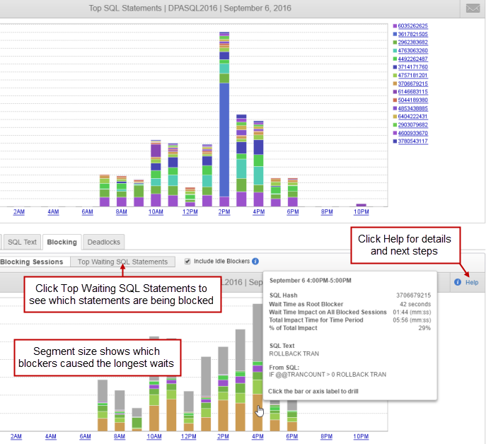 Are blocking sessions causing performance problems in your environment? Use the Blocking tab to identify the root blockers, find out which SQL statements are being blocked, and determine which blocking sessions are responsible for the longest overall waits. DPA shows the aggregated wait time for each blocker, which helps you focus your tuning efforts on blockers with the largest impact.