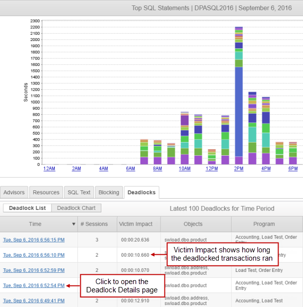 For monitored SQL Server database instances, DPA provides detailed information about deadlocks, including the Victim Impact (how long the deadlocked transactions ran).