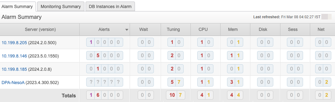 Alert information is available in DPA 2024.2 and later. For DPA servers running earlier versions, a question mark is displayed. Upgrade your DPA servers to 2024.2 or later to see alert information for all servers.