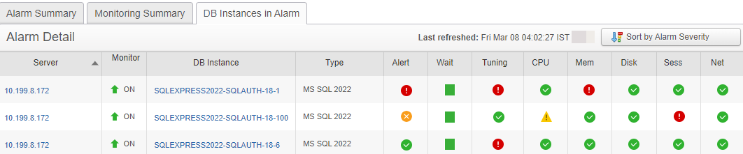 On the Central page, click the DB Instances in Alarm tab to see which monitored database instances have triggered alerts or alarms. The color of the square or icon indicates severity.