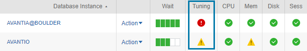 The Tuning column on the DPA home page displays a warning or critical icon when advisors with a warning or critical status are available for a database instance. A green check mark in this column indicates that there are no advisors or that all advisors are informational.