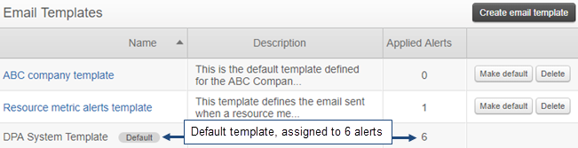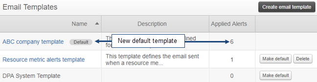 "Default" appears next to the template's name, and the number of Applied Alerts is updated. All alert definitions with "Use Default" in the Email Template field now use this template for email notifications.