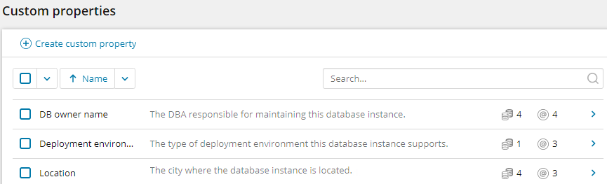 The Custom properties page lists existing custom properties. It shows the number of database instances each property is assigned to and the number of values defined for the property.