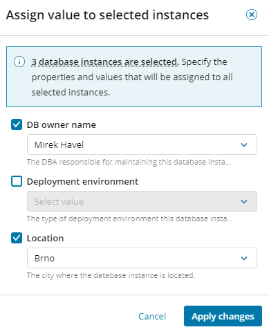 If a custom property applies to a database instance, assign the appropriate property values to that instance. You can assign multiple values for the same property.