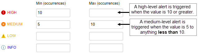 When you enter a Max value for a level, DPA alerts at that level when the value is greater than or equal to the Min value but less than the Max level. For example, if the Min value is 5 and the Max value is 10, DPA alerts at that level when the value is 5 or more, but less than 10.