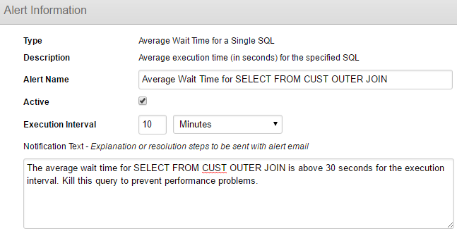 The execution interval specifies how often the alert runs and the amount of data that DPA examines. For example, if the execution interval is 10 minutes, DPA executes the alert every 10 minutes and examines the last 10 minutes of data to determine whether to trigger the alert. DPA recommends an execution interval of at least 10 minutes to prevent unnecessary alerts from a single slow execution or temporary condition.