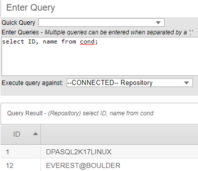select ID, name from cond;The query returns the names and IDs of all monitored database instances.