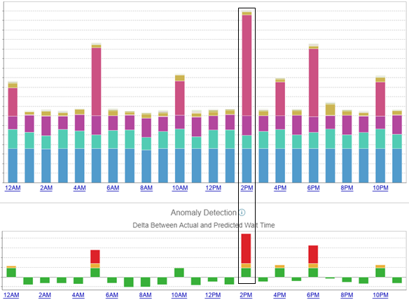 The one-day Anomaly Detection chart shows the hours when anomalies occurred. In this example, the 2 PM hour had the highest unexpected wait times.