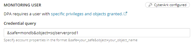 After the restart, the affected DPA wizards and other interfaces display a field for the CyberArk credentials query instead of the user name and password fields.