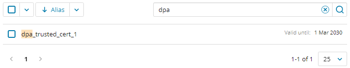 Enter a string in the search field to search for a certificate by alias name. The list is filtered to show only certificates whose name includes the search string.