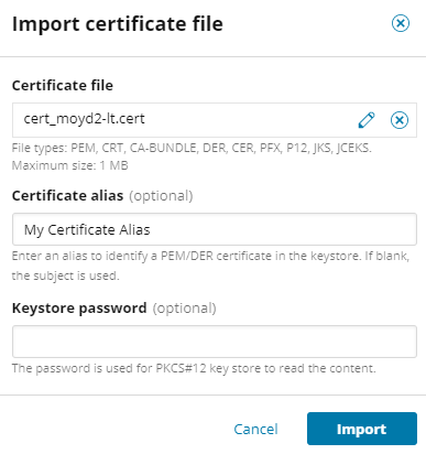 You can import a file that contains a single certificate, or you can import an entire keystore.